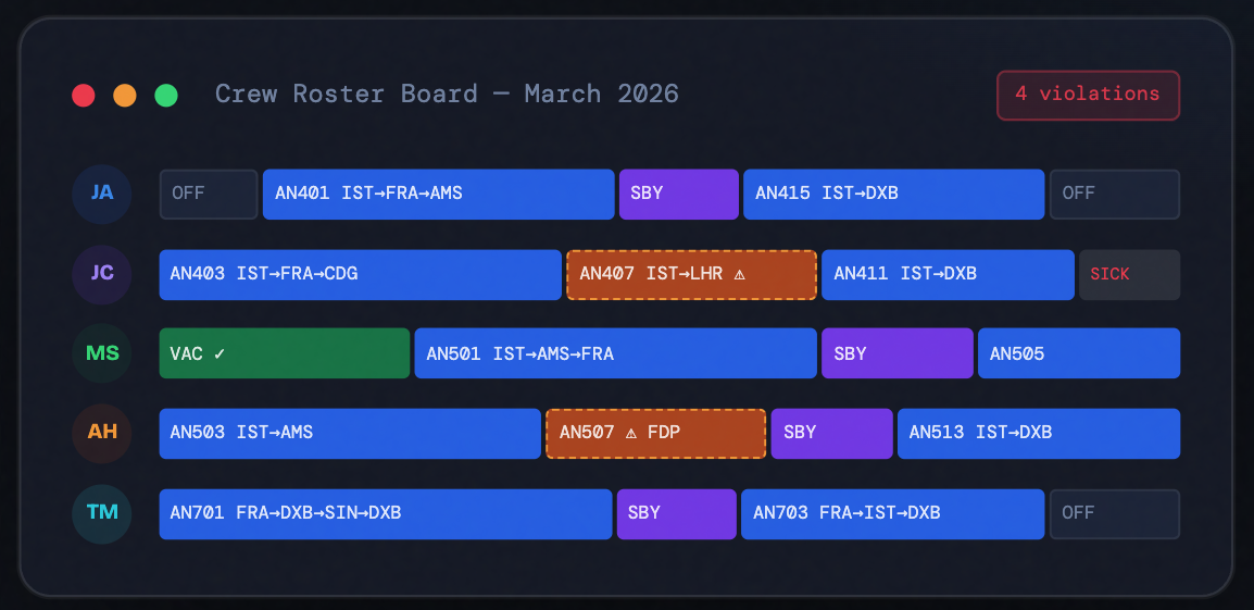 Fatigue Management module computes individualized biomathematical alertness curves for every crew member based on their actual duty history and circadian phase, surfacing a fleet-wide fatigue heatmap that shows who is approaching critical thresholds before the roster is ever published. Fatigue scores feed directly into the crew optimization to generate rosters that are not just legally compliant, but physiologically sound from the start.