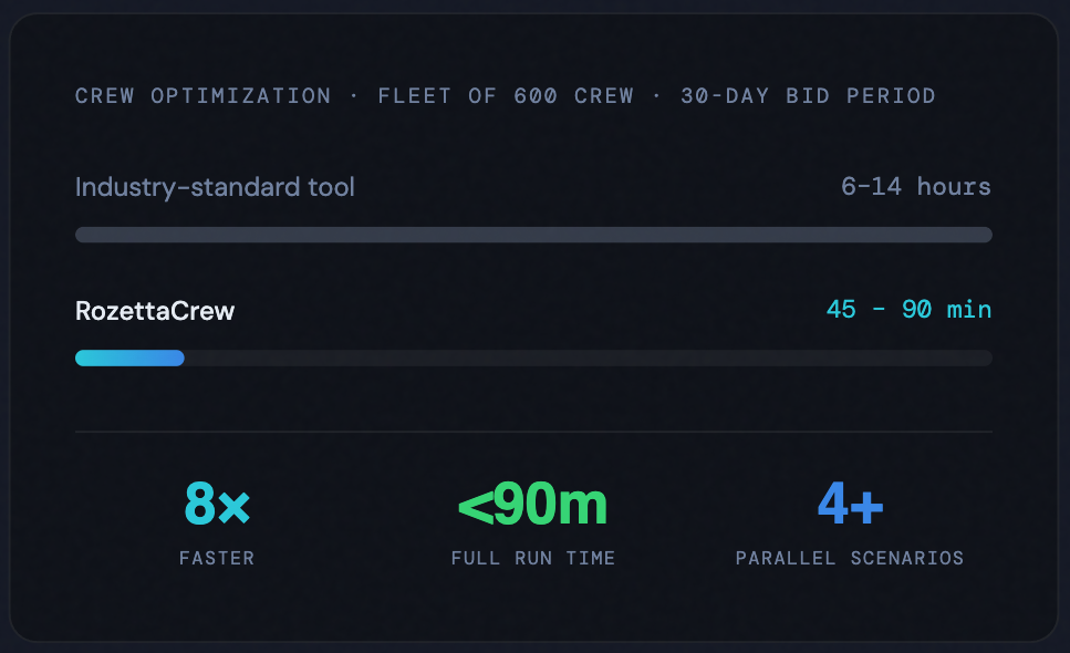Conventional crew optimization tools treat pairing and rostering as sequential batch jobs. This often takes 6 to 14 hours to produce a single solution for a mid-size fleet. RozettaCrew’s optimization engine generates optimized rosters under 90 minutes for 600+ crew across a 30-day bid period.