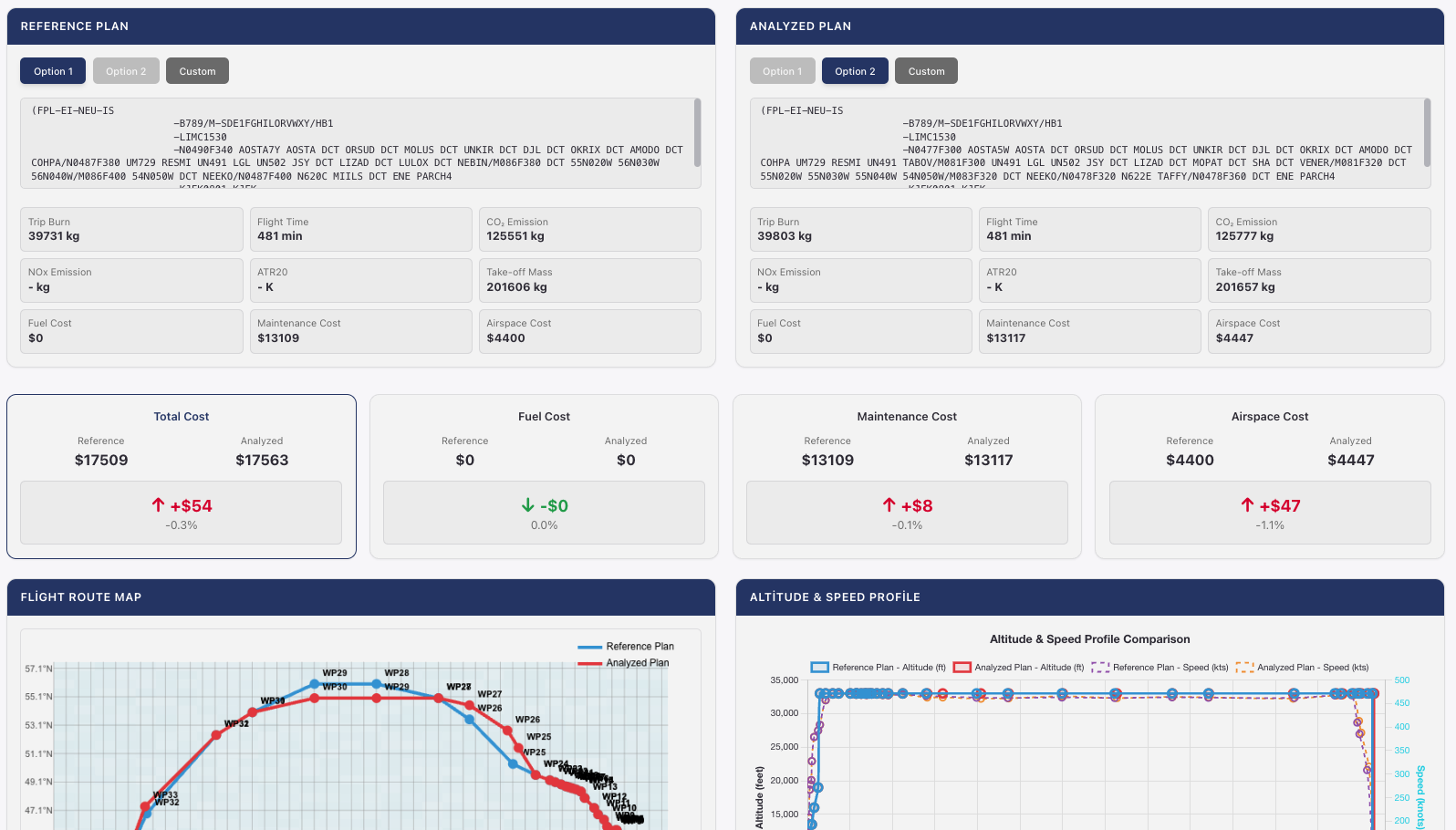 Put any two plans side by side — from route geometry to cost breakdowns. See exactly what each option trades off in fuel, maintenance, airspace charges, and total operating cost.