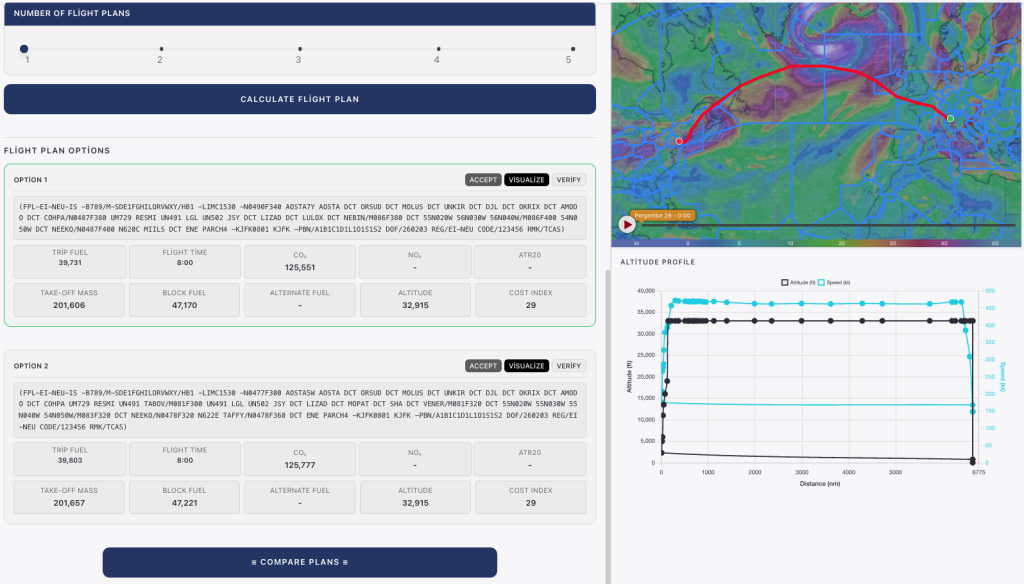 Every flight plan includes full environmental impact metrics — enabling airlines to quantify, compare, and reduce their climate footprint at the operational level.