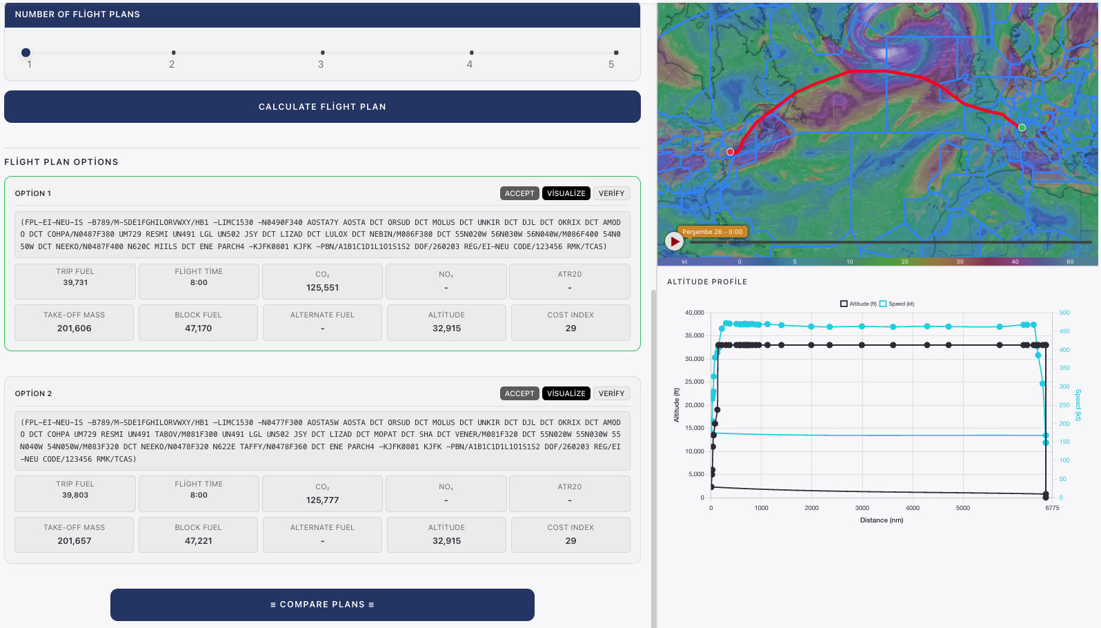 Every calculation returns several distinct route options — each fully computed with trip fuel, flight time, CO₂ emissions, take-off mass, block fuel, altitude profile, and cost index. No more single-plan guesswork.