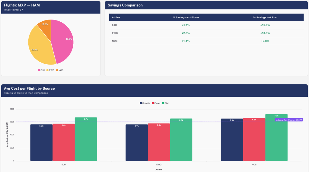 - Average cost per flight by source (Rozetta, Flown, Plan)